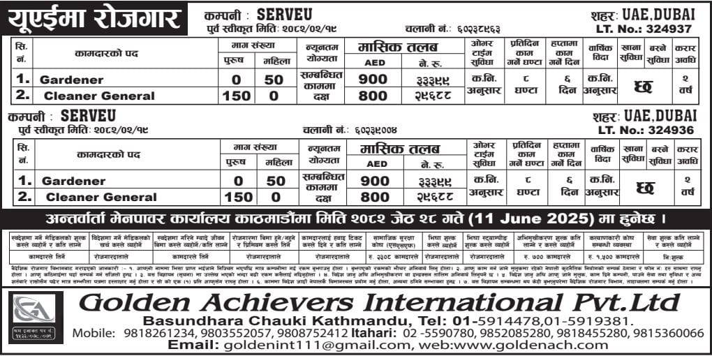 A golden opportunity has arrived for those seeking employment in Dubai through Golden Achievers International Pvt. Ltd. The well-known company SERVEU in UAE is hiring candidates for the posts of Gardener and Cleaner General. The final interview will be held on June 11, 2025, at the companyβs office in Kathmandu, Nepal.